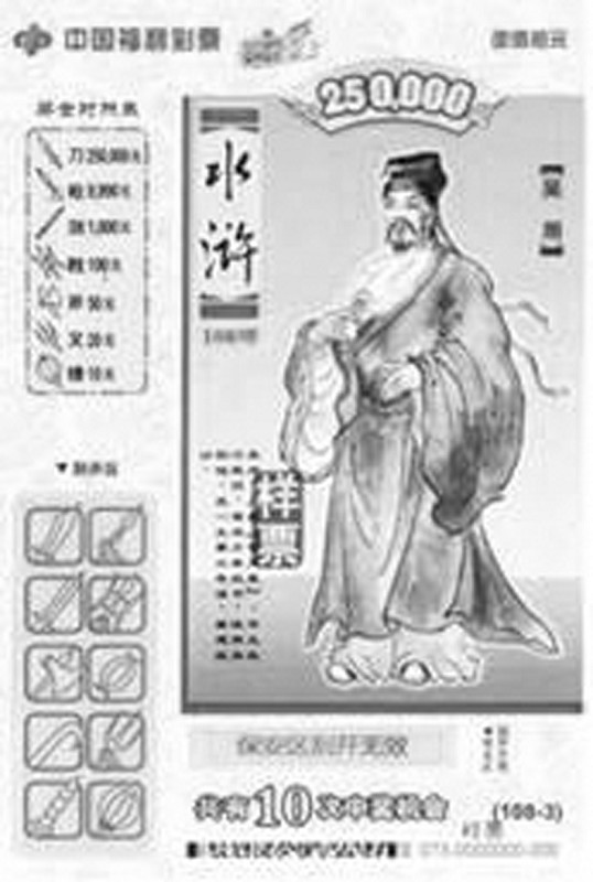 新票种“水浒108将”全面介绍了水浒的人物,108个人物个个栩栩如生。每一个英雄人物背后都是一个传奇的故事,“水浒108将”对每一个人物都作了简要的介绍。“水浒108将”在突出水浒人物的同时,彩票本身也有诸多突破。彩票面值十元,共有十次中奖机会,寓意十全十美。彩票票面更大,更精美,每一张彩票都是一幅独立的水浒人物图,而连在一起,就成了“水浒108将”的英雄谱。彩票的头奖更大,达到25万!