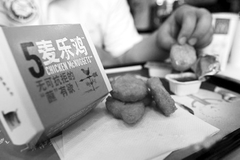 一名顾客在麦当劳北京一门店品尝麦乐鸡。