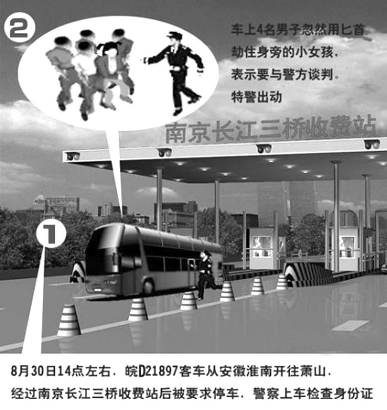 8月30日14点左右,南京长江三桥收费站以北,一辆从安徽淮南开往浙江萧山车牌为皖d21897的红色大客车被劫匪劫持。南京警方快速处置,犯罪嫌疑人阳兵(男,32岁,重庆开县人)被警方当场擒获,两名人质成功获救。
