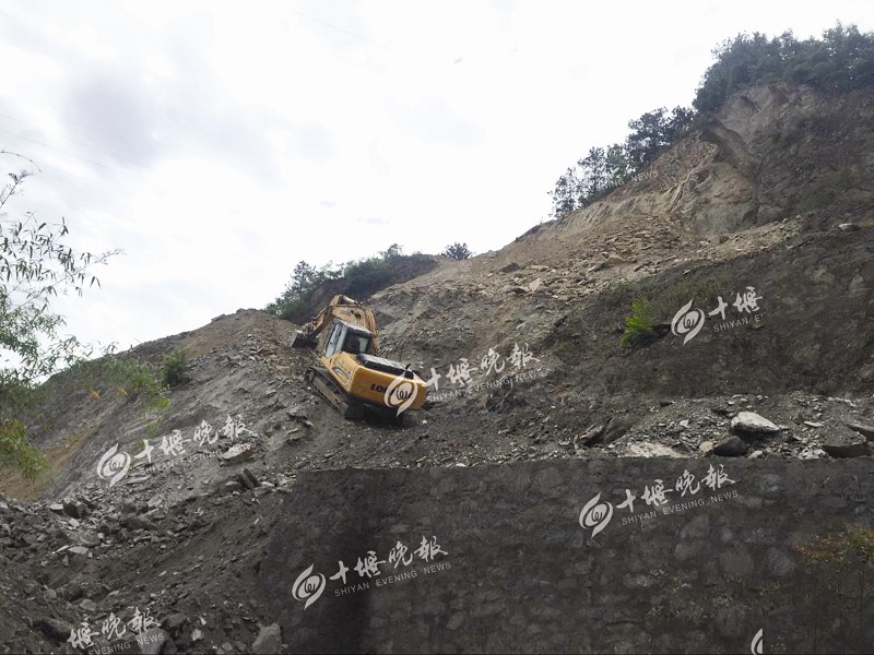 施工现场挖掘机正在对危险山体进行排险。