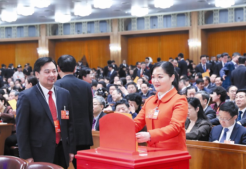 3月19日,十三届全国人大一次会议在北京人民大会堂举行第七次全体会议。这是代表在投票。新华社发