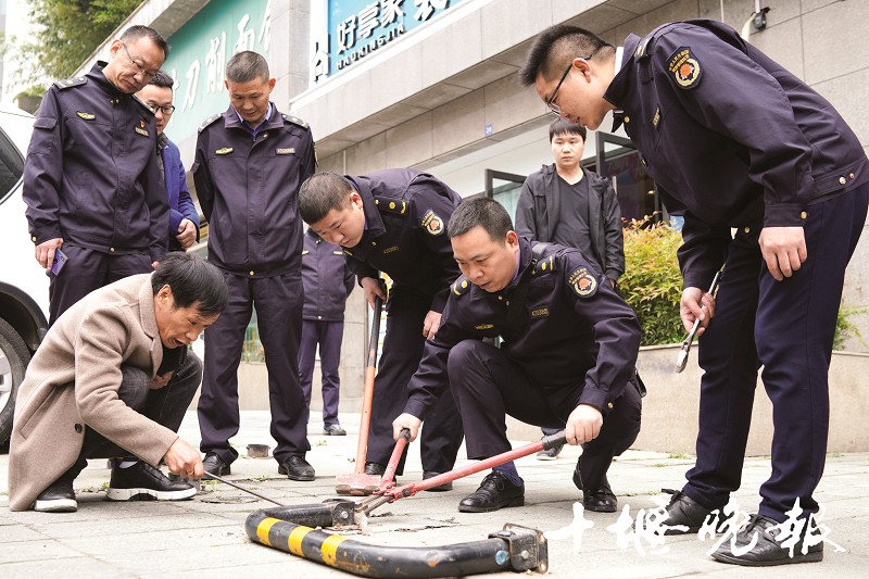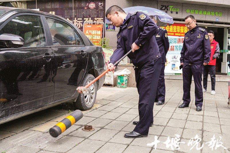 人行道私设地桩、地锁,不仅影响通行,还占用公共位置。昨日上午,张湾区城管执法局车城执法大队联合蓝山郡社区居委会,对凯旋大道两边十余处私自设立的地桩、地锁进行拆除。 图/记者 刘成臣