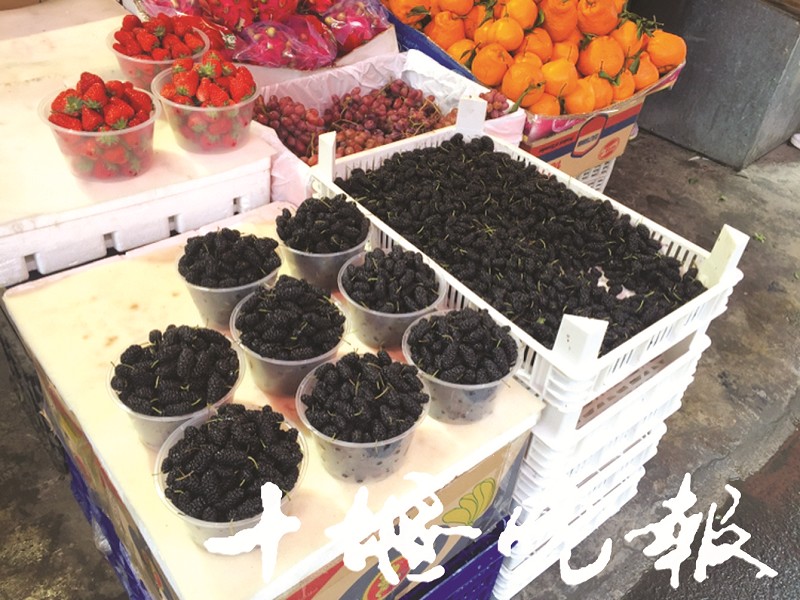 “桑葚十块钱一斤,上市时间短,喜欢吃的,抓紧时间买哟。”昨日,记者走访城区多家菜市场、水果店,发现素有“清热果”之称的桑葚已大量上市,每斤售价8元至10元不等,价格与去年同期持平。