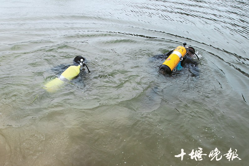 7月9日上午,郧阳区天马大道附近汉江畔。阴云散去,阳光照在脖子上,火辣辣的。“今天天气不错,很适合下潜。”赵勇坐在船头,背上氧气瓶,与岸上的4名伙伴聊着天。赵勇从事潜水18年,其他4人都是他成立公司后加入的,由他一手带上路。