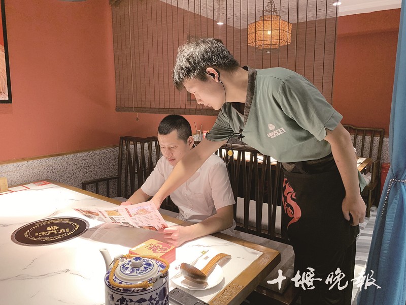甲天下烧鸡公天津路旗舰店,服务员正在根据客人人数推荐菜品。