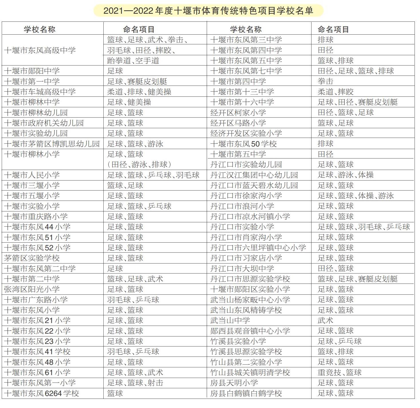 本报讯 日前,记者从市文旅局获悉,为推动学校体育工作,促进学校业余训练开展,进一步发展壮大体育传统特色项目学校建设,发现培养优秀体育后备人才,我市公布了2021年十堰市体育传统特色项目学校名单,十堰东风高级中学、郧阳中学、十堰市第一中学等67所学校入选,正式获评2021年十堰市体育传统特色项目学校。这些学校将根据特色体育项目得到一定的支持经费。
