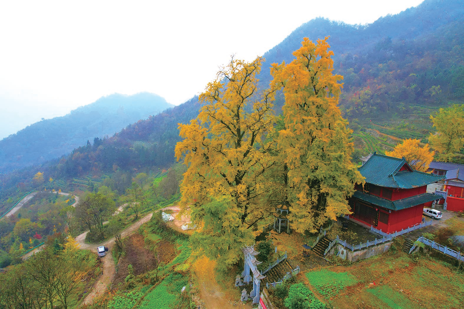 丹江口官山镇:古寺遗址前,“夫妻银杏树”相依偎