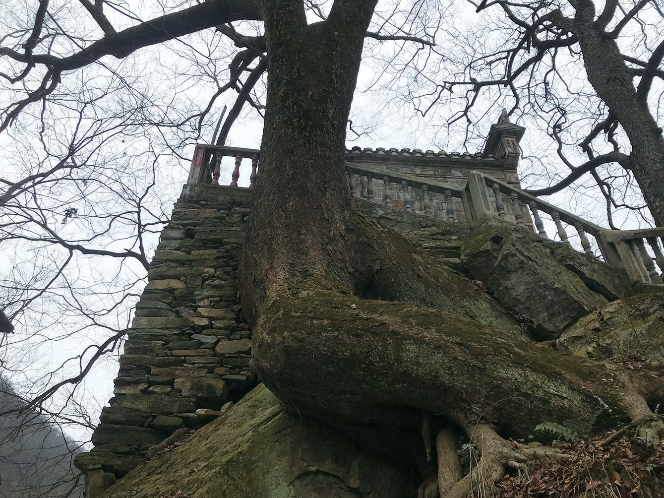 站在距离桥上小学约两公里的地方,就能看到校园上空密密麻麻的古树枝干。尽管树叶落尽,但黝黑粗壮的枝干仍然雄伟苍劲,让人心生向往。走进校园内,只见这些古树全部长在一个十几平方米的锥形巨石上。为了保护这些古树,巨石底部设置围墙、铁门,进入铁门后可通过台阶一直走到巨石顶部。