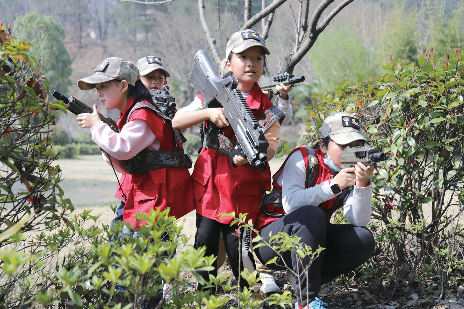 本报讯 “前方发现敌情,注意隐蔽!”“收到!正面掩护,侧翼包抄。”3月13日,在茅箭区百二河户外公园,一场紧张刺激的“战斗”正在进行,小记者彭俊杰一边传达着作战计划,一边弓着腰架着抢,寻找目标,瞄准发射,还有的小记者则匍匐在地,埋伏等待“目标”的出现,现场“硝烟弥漫”,“枪声”四起。