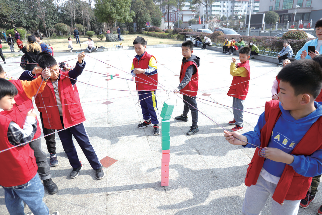 在“步步高升”环节,小记者们摒弃凝神,每个人拽着绳子的一端,合力将绳子中间托盘上的教具从 A点运送到 B点,并依次摞好。根据安排,2支队伍轮番体验。“稳住,我们能赢。”“千万别慌!”体验过程中,小伙伴们互相帮助,围观的队伍大声加油,成功的队伍第一时间赶来分享经验,活动现场热闹非凡。