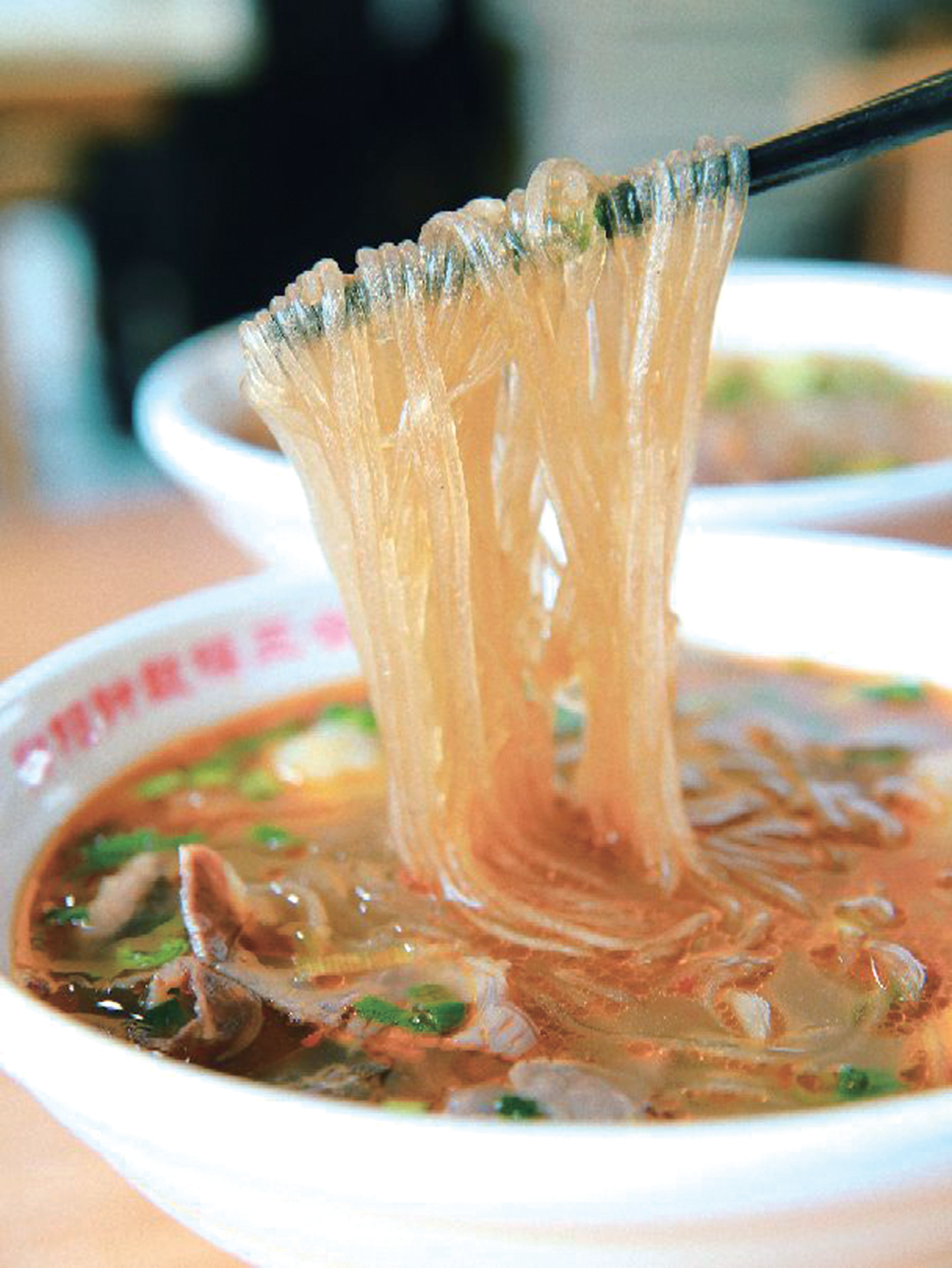 煮红薯粉,最重要的是控制火候。将事先浸泡好的粉条抓入竹笊篱过滤,入沸汤滚三滚捞起来,这时的粉香味刚刚好,根根分明、晶莹剔透,弹牙、爽口、嫩滑;然后将粉条倒入大碗,再取几个饺子,抓几片牛肉入碗,从锅里舀两勺滚热的汤汁浇在上面,撒上香菜、葱花和蒜泥等配料,便可食用。
