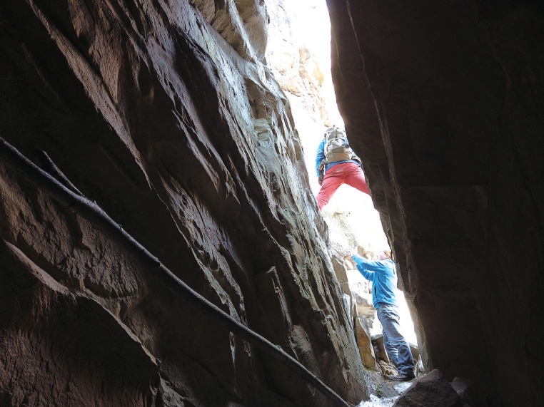 “飞来石”下方,一条只容一人通过的裂缝出现在脚下,即为驴友们所说的“一线天”。走进裂缝,两边岩石高耸,只有头顶落下微弱的一线天光。行进五六米,才发现裂缝两侧出口让人有豁然开朗之感,下方均为深渊。