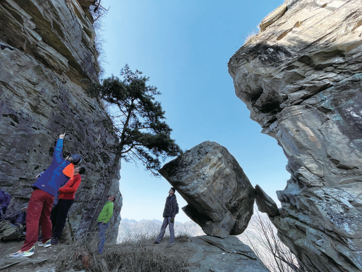 我们返回时绕行到孤峰后侧,这才看到,在高耸的孤峰旁,还有一座体量更小的独立山峰。两峰之间矗立着一块3米多高的“飞来石”,触地面积不足一平方米,有摇摇欲坠之感,似乎一阵微风就能跌落山崖。