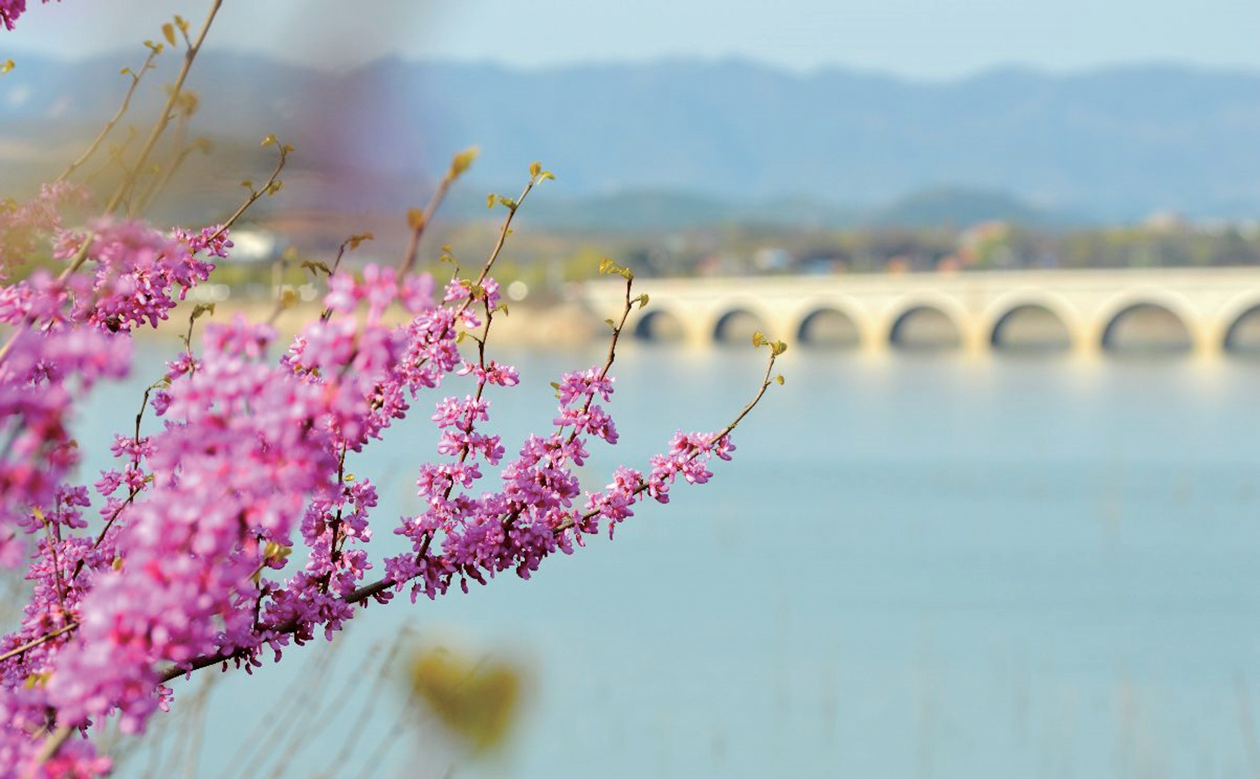 23日,记者在郧阳湖国家湿地公园看到,百余株紫荆花展露芳华。湛蓝的天空下,湖水波光粼粼,粉嫩嫩的紫荆花挂满枝头,灿烂开放,不少游客前来赏花、拍照打卡。图/记者 张婧