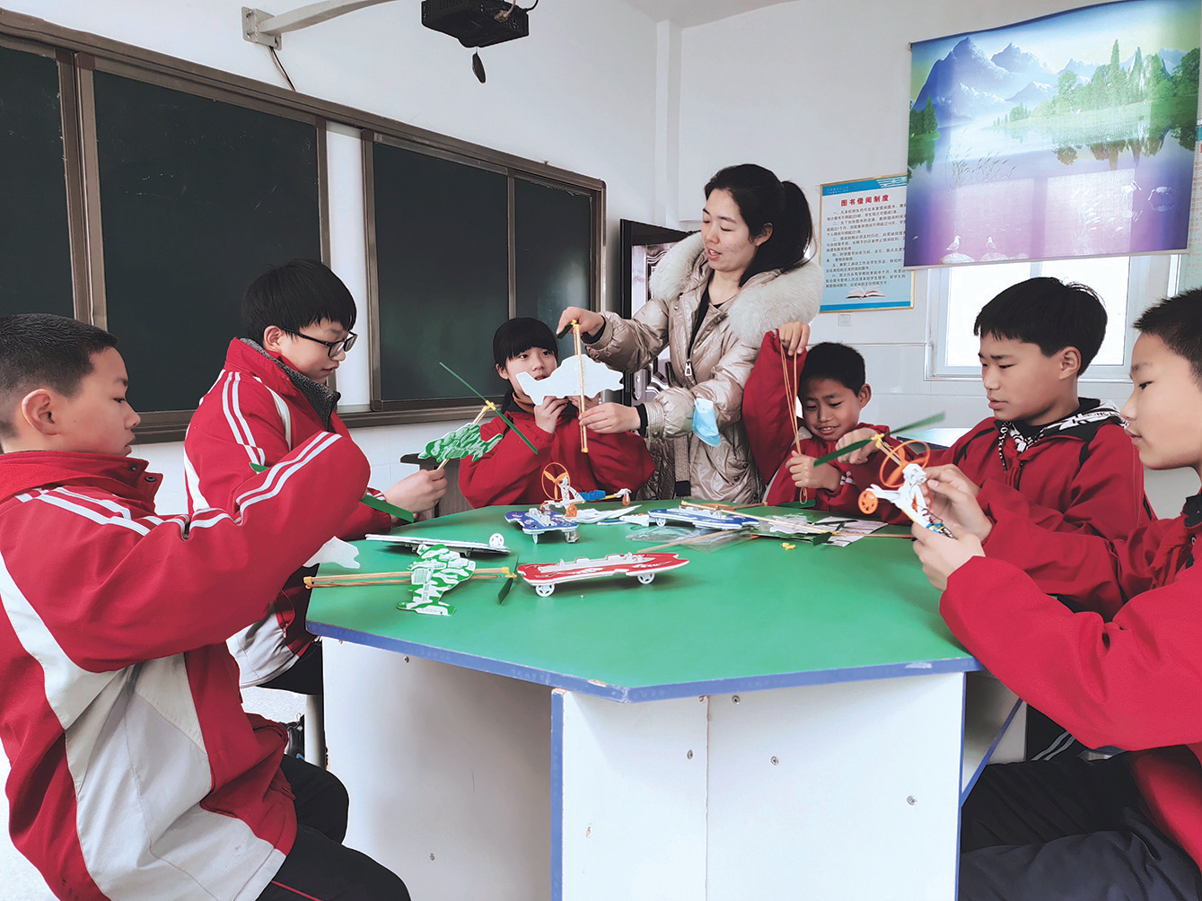 郧西县河夹镇中心小学老师带领着学生们做航模。