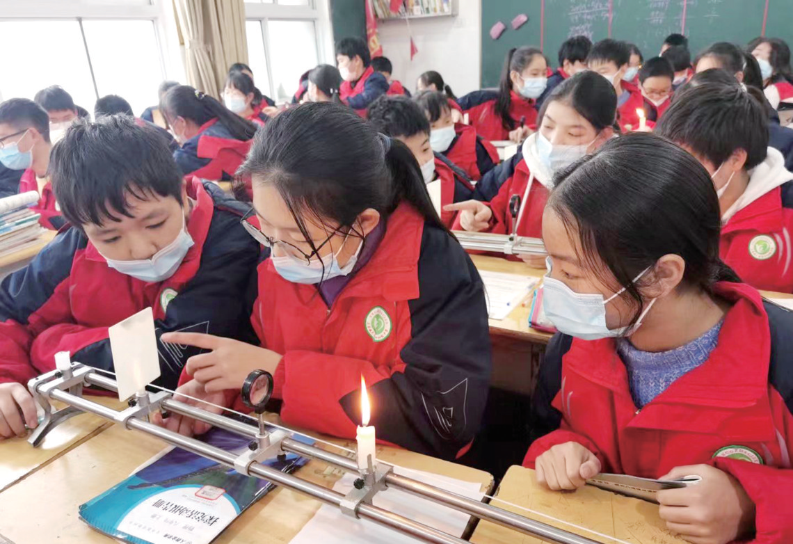 房县城关四中学生小组合作进行科学实验。