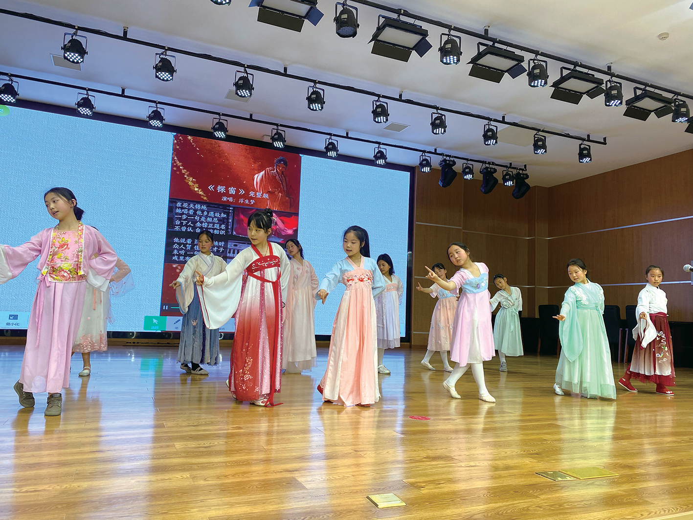本报讯 3月24日,市重庆路小学开展“戏曲进校园”展演活动。体艺楼报告厅内,学生们身着戏服、头戴英冠,画着精致的妆容,跟随节奏翩翩起舞,动作时而优雅,时而激情澎湃,举手投足间尽显戏曲魅力。
