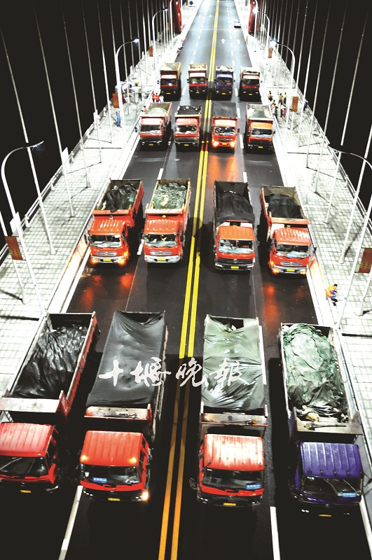 6月29日19时,中铁大桥局集团武汉桥梁科学研究院工程技术人员对试通车满一个月的郧阳汉江大桥进行全面技术测试。现场调动16辆载重车(每辆车货总重30吨)共480吨载力,进行12个小时测试,测试报告半个月后汇总出具,供专家组对大桥最后评估验收。