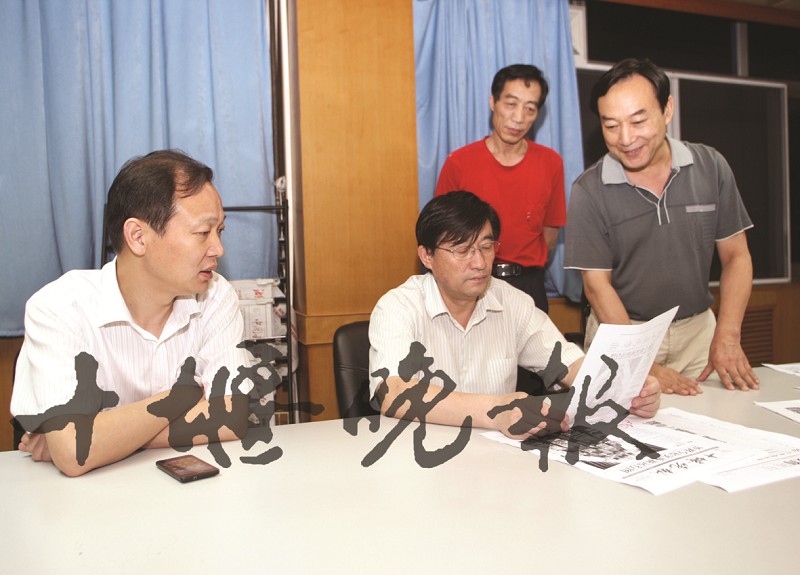 吴世杰(左二)在本报编辑部审看改版报样。