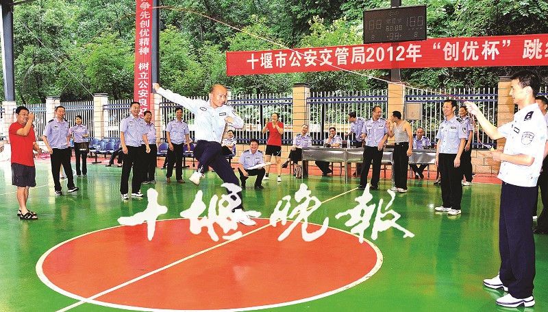 昨日上午,市公安交管局举办民警跳绳比赛迎接党的生日。各单位均派出最强阵容,车管所拿下男子组第一名,成绩为两分钟272个,这个成绩在女子组只能排第三名;女子组冠军被一大队民警获得,成绩为两分钟350个。
